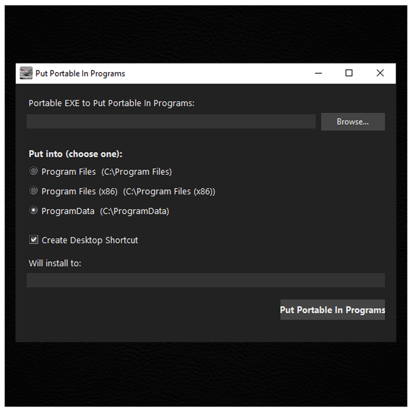 This is a simple utility to add "portable" or "stand-alone" applications to specified directory location. - All this does is copy the selected EXE to the specified area, and allows the user to create a desktop shortcut.